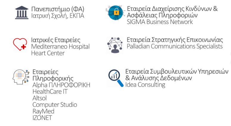Για την επίτευξη των στόχων του έργου έχει αναπτυχθεί ένας συνεργατικός σχηματισμός καινοτομίας (ΣΣΚ) με τη συμμετοχή 11 επιχειρήσεων που δραστηριοποιούνται στα πεδία της υγείας, πληροφορικής, διαχείρισης κινδύνων και ασφάλειας πληροφοριών, ανάλυσης δεδομένων και στρατηγικής επικοινωνίας υπό το συντονισμό της Ιατρικής Σχολής του ΕΚΠΑ που αποτελεί τον Φορέα Αρωγού του έργου.